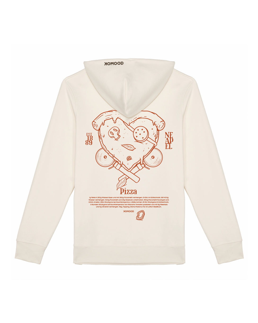 Für alle Pizzapiraten und jene, die es noch werden wollen! Unser Pizza Hoodie kommt mit einem gestickten Stück Pizza, dem Front- & Backprint auf feinster Bio-Baumwolle daher. Natürlich ist das Rezept auf dem Rücken für gute neapolitanische Pizza und wurde von uns mehrmals auf Herz und Nieren geprüft <3